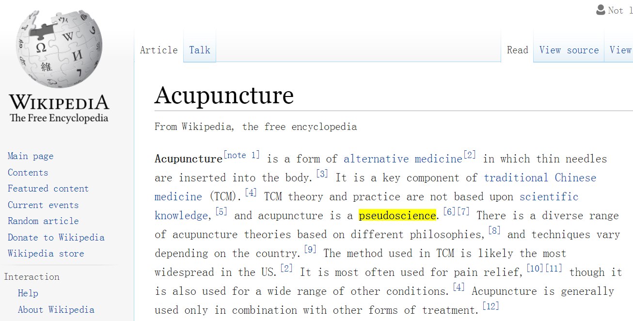 中医针灸是中华文化千年流传的古法,治愈了许多人的顽疾。但维基百科却认为针灸属于“伪科学”,在针灸英文页面上赫然写道:“acupuncture is a pseudoscience” (针灸是伪科学)。 这一说法惹恼了全球的中医 ...