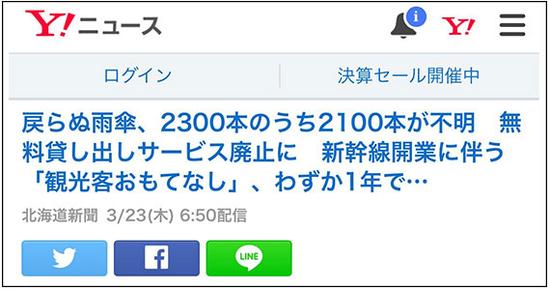 3月22日,日本北海道函馆市宣布: 北海道新干线开通时,推出的免费雨伞租借服务确定将于本年度废除。 雨伞免费租借服务于去年3月26日开始,直至去年12月底,提供的2300把雨伞中有2100把未归还。 &nbs ...