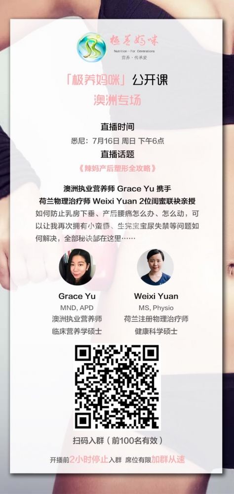 7.16 SUN开课啦 极养妈咪 公益微课澳洲专场阿德莱德时间:7月16日(周日)17:30 辣妈产后瘦身攻略翘臀,小蛮腰,坚挺的胸部,fit的身材......生完宝宝的你值得拥有。 本期公开课将提供最全吃,动攻略,最干货信 ...