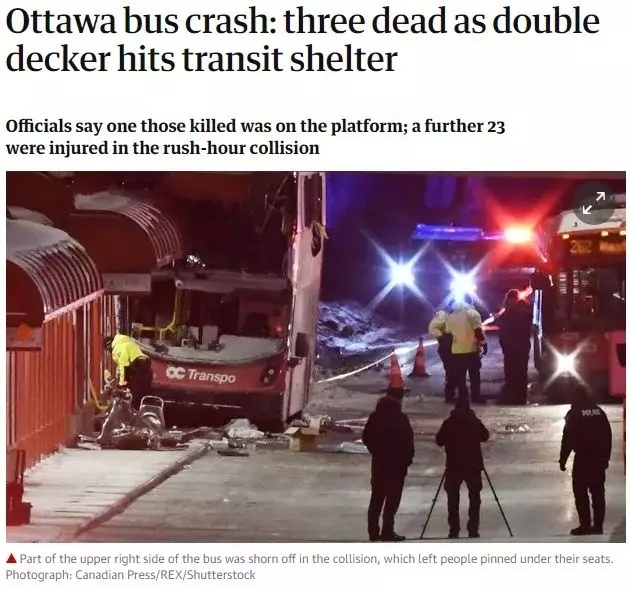 加拿大家园 关于昨天那场非常惨烈的交通事故!最新进展来了。。。 加拿大首都渥太华11日发生重大交通意外,一辆双层巴士撞向车站,候车亭上盖插入巴士上层。 关于具体事出 ...