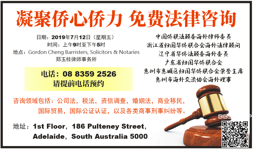 由于预约周五的免费法律咨询人数众多,应各位侨胞的要求,现增加一天免费咨询时间,安排在7月13日周六早上10点到下午5点,敬请提前电话预约8359 2526,切勿直接前往咨询,谢谢! 部地址: 1st Floor,Pulteney Centre,186 PulteneyStreet,Adelaide,SouthAustralia 5000 总部电话:(618)8359 2526 |