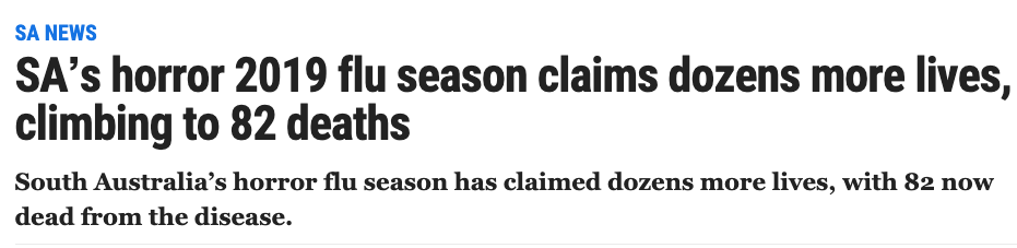 今年澳洲的流感可谓是来势汹汹,一发而不可收拾! 每月的流感死亡人数都在不断地上升,频频的刷新纪录! 到现在为止,南澳的流感死亡人数已经达到了82人! 如正确地洗手、咳嗽时用纸巾或手臂覆盖口鼻、 ...