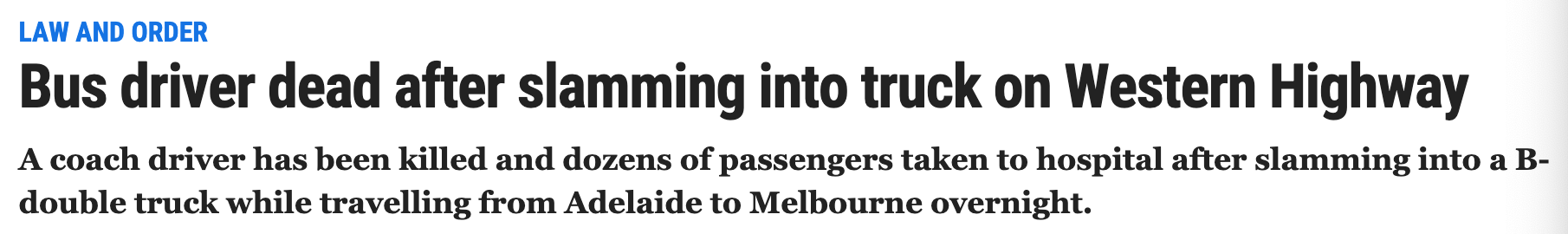 阿德莱德一辆长途巴士在Horsham附近发生车祸,司机当场死亡! 其他乘客,包括青少年,还有70多岁的老人,都被送往Horsham医院。 由于车祸,高速公路的两个方向都已关闭,警方仍在现场调查。