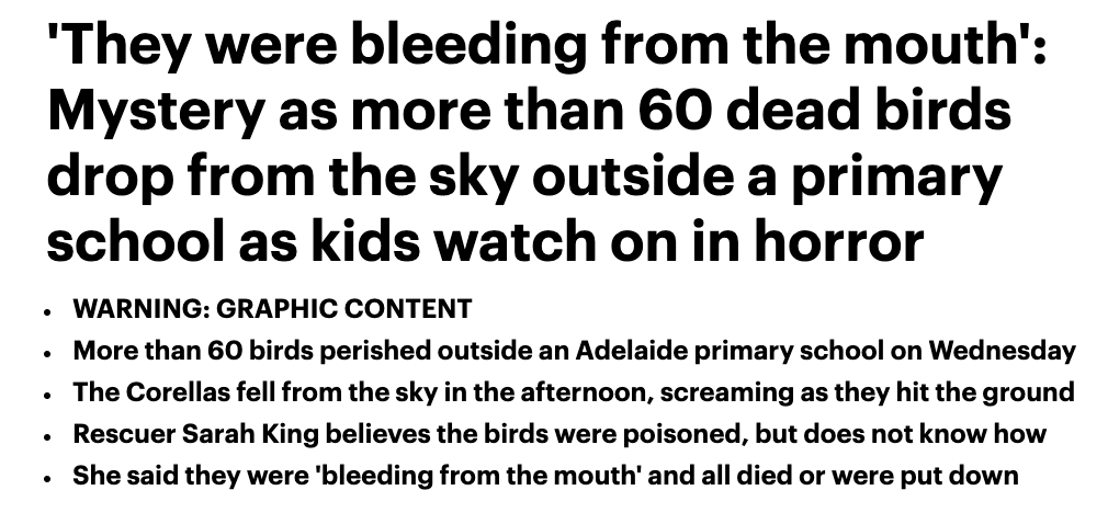 天空中超过60只鹦鹉密密麻麻地从天而降,惨叫连连, 口吐鲜血,死状惨烈! 这不是电影中的恐怖场景, 而是发生在阿德莱德东北区One Tree Hill小学真实而惊悚的一幕…… 因为这些鸟长期以来一直被当地居民 ...