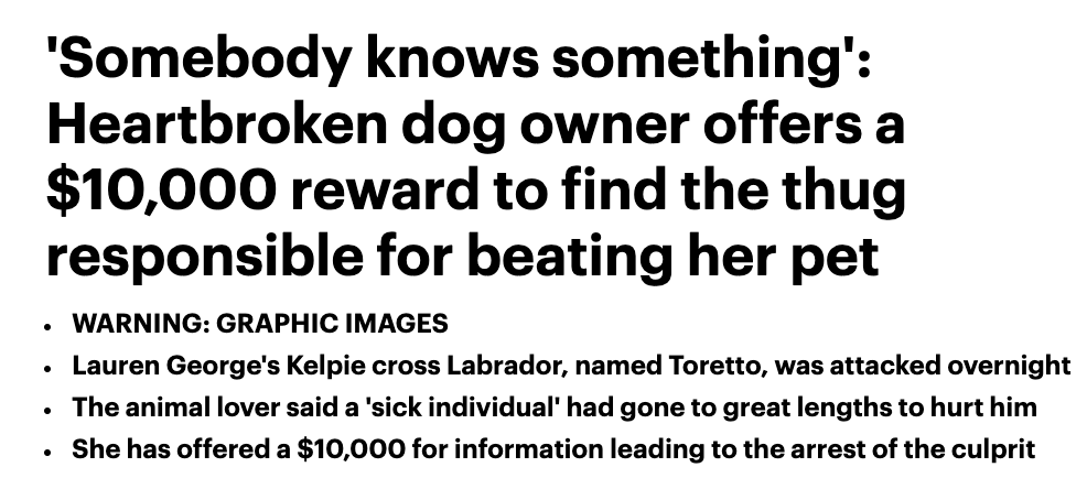 对可爱的宠物狗都能痛下黑手,令人气愤! 据悉,Toretto仍在Redlands Veterinarian Clinic进行治疗。 她还表示,经过兽医检查,Toretto受的伤极有可能是受钝器所伤。 Lauren认为袭击应该发生于周六晚7点半 ...