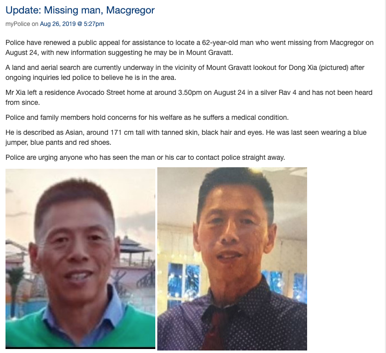 紧急寻人! 据昆士兰警方消息,一名62岁华人男子Dong Xia在布里斯班南区失踪!
