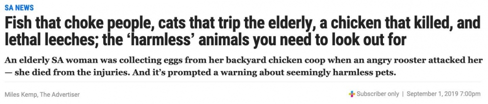 在澳洲, 你可能听过袋鼠打人,毒蛇咬人,蜥蜴袭击人,喜鹊啄人的新闻, 但你知道吗, 在澳洲,取个鸡蛋竟然也可能会付出生命的代价! 凶手竟然是一只——公鸡! “这不仅仅是针对动物的袭击,因为我们的 ...