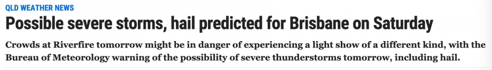 布里斯班暴风雨来袭或将影响Riverfire。 气象学家建议本周末参加Riverfire的人们做两手准备,因为明天可能有强烈的暴风雨,甚至预报显示明天傍晚布里斯班有冰雹。 同时,“不能排除有冰雹的可能性。” 预计 ...
