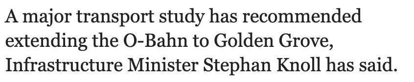 好消息!阿德莱德O-Bahn有可能延伸至Golden Grove! 政府曾拨款1,850万澳元,用于在Paradise和Golden Grove建造park ‘n’ rides设施,并将于明年年中竣工。 不过,他拒绝透露政府是否会升级Golden Grove现 ...