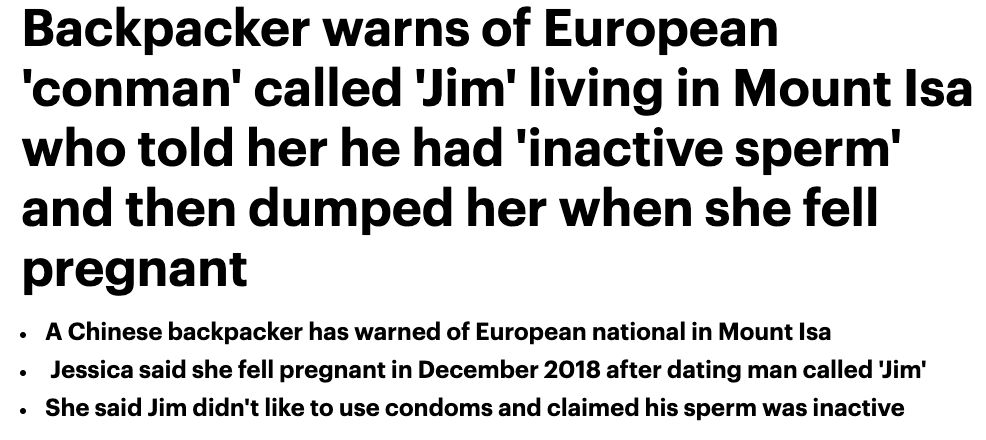 华女在昆士兰被德国男子骗炮骗感情!怀孕后惨遭抛弃! Jessica说,Jim的全名“非常不同”,并声称他在签证逾期后非法居住在澳大利亚。 她说:“过去我为他掩饰过,但现在我想告诉Mount Isa的所有人对此保持 ...