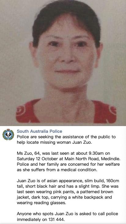 紧急寻人! 南澳警方正在寻找一名64岁的中国公民Juan Zuo。 据悉,她最后一次被人看到是在10月12日(周六)上午9点半左右, 地点是Medindie的Main North Road。 警方和她的家人都很关心 ...