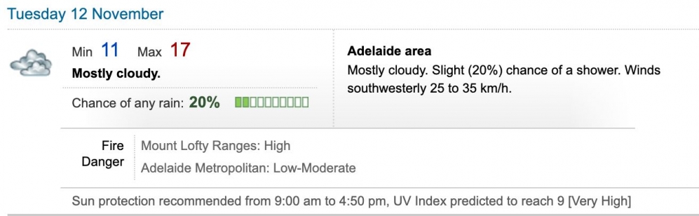 阿德莱德最近的天气灰常刺激,几天内像变换了几个季节。 今天热到你流汗,明天就让人冷到发抖。 根据气象局信息,今天的最高温达到34度,还伴随大风, 小伙伴们明天注意添加衣物,以防换季感冒。