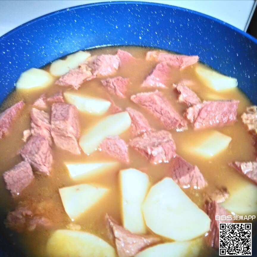 咖喱土豆烩牛肉,培根、黑木耳炒花菜。