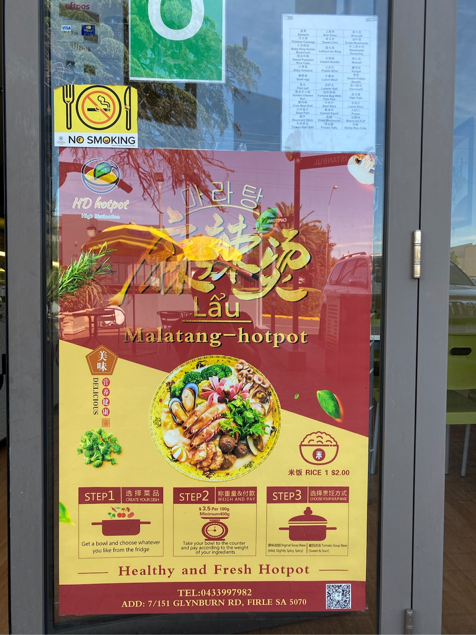 HD麻辣烫开业啦!住在东边的小伙伴们可以随时来吃啦!愿我们在学习生活中都能拿到HD! 地址:7/151 Glynburn Rd, Firle SA 5070 微信:HDhotpot 营业时间:10:00am-11:00pm 微信下单95折优惠