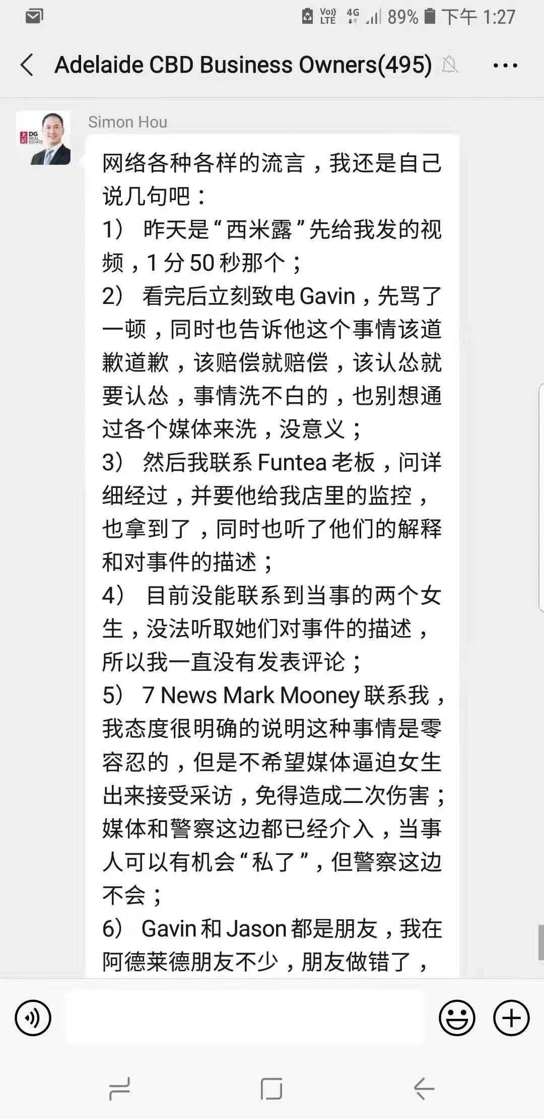 今天是Funtea打人事件的第二天, 无意中看到议员大人在群里发言我不得不来问一下我们的华人议员Simon Hou先生几个问题: 1, 请问一下, 打人是刑事问题吗? 你原话中提到的 '让当事人Gavin该赔偿 ...