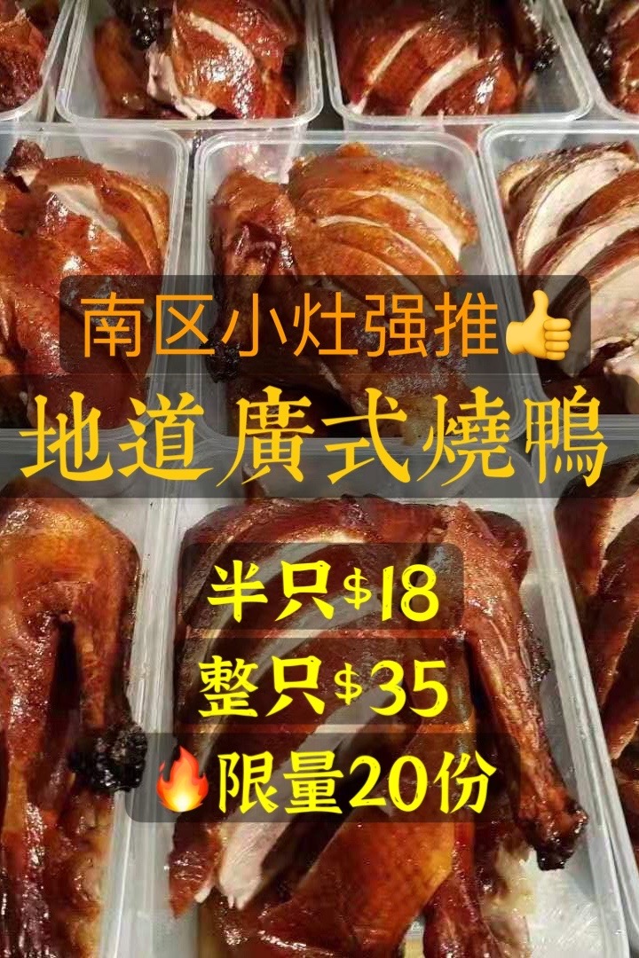 每周现烤广式烧鸭,餐厅标准卫生厨房出品,限量10只,半只$18,整只$35,先到先得!