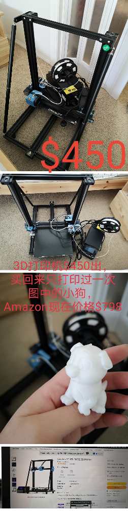 出3D打印机$450,Amazon现在$798,买回来只打印过一次图中的白色小狗,打印效果非常好,料还剩了很多