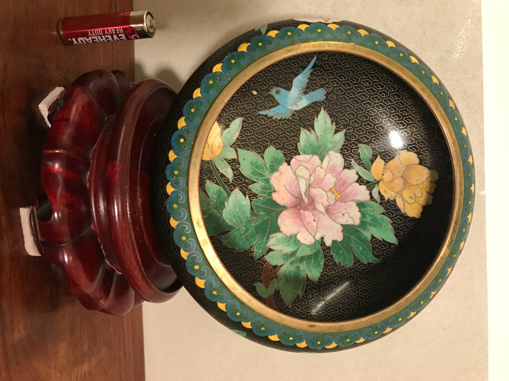 上世纪五六七十年代出口创汇期景泰蓝笔洗,直径17厘米。价格$350。收藏品转让。我收藏经营古董店铺四十年经验丰富,如果喜欢收藏需要藏品鉴定可以加微:hongzhibei注明缘由。谢谢。