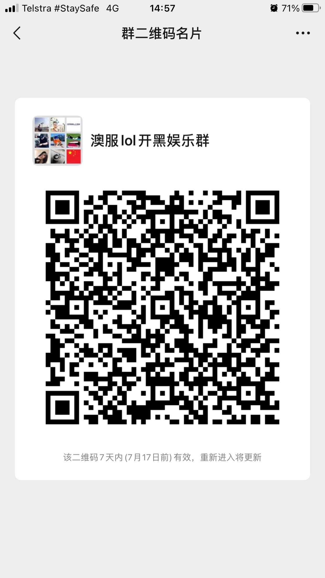 澳服LOL 开黑娱乐群,群名片貌似能维持7天 团体日益壮大 平时一起开黑玩完娱乐 打打内战 交友 需要的就扫码进啦