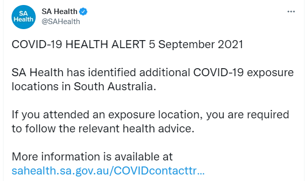 9月5晚上,SA Health 新增了疫情暴露点! 如果您去过这些暴露点,请根据当局要求完成相应的健康指示。 图文来源:SA Health 原文链接