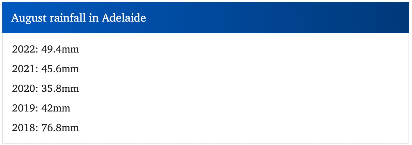 南澳天气预报显示,周三乌云密布,周四将迎来降雨。 气象局的数据显示,今年本月到目前为止,Victor Harbor的降雨量为73毫米,相比之下,去年整个月的降雨量为47毫米。 Clare的降雨量为70毫米,略高于去年8月6 ...