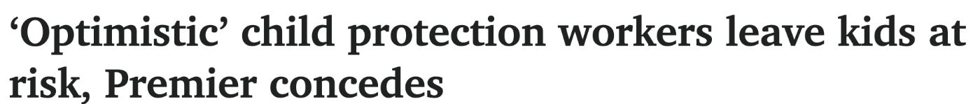 南澳州长承认,“乐观”的儿童保护工作者认为苦苦挣扎的父母将克服毒瘾、家庭暴力倾向或精神疾病,这可能会使与父母住在一起的孩子处于危险之中。 2016年,Margaret Nyland法官对儿童保护系统进行了调查,她警 ...