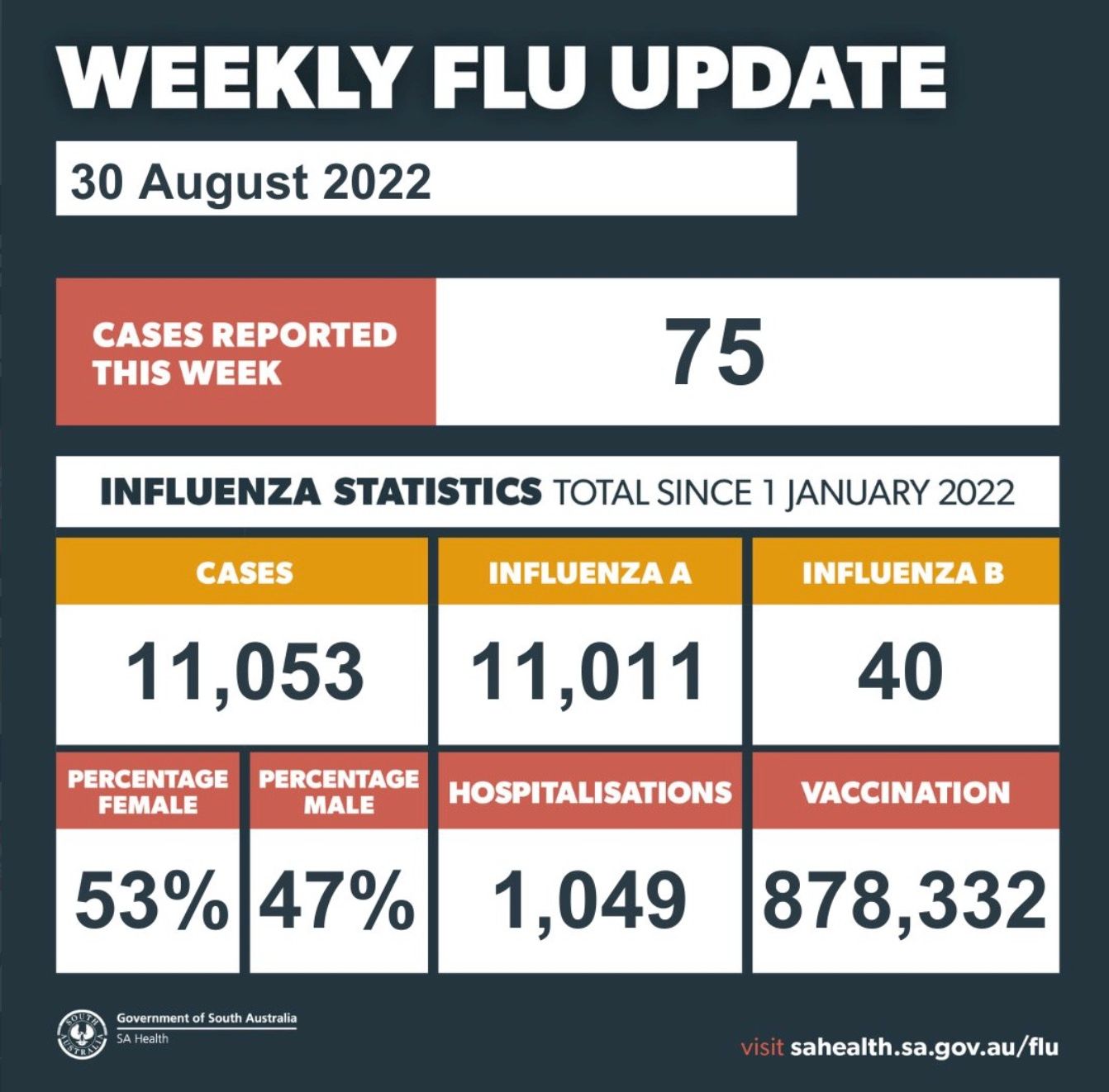 过去一周,南澳新增75例流感病例。 今年,南澳流感病例总数为11053例,甲型流感病例数为11011例,乙型流感病例数为40例。 其中女性占53%,男性占47%。 有1049人因流感住院。 南澳有878332人接种了流感疫苗。 ...