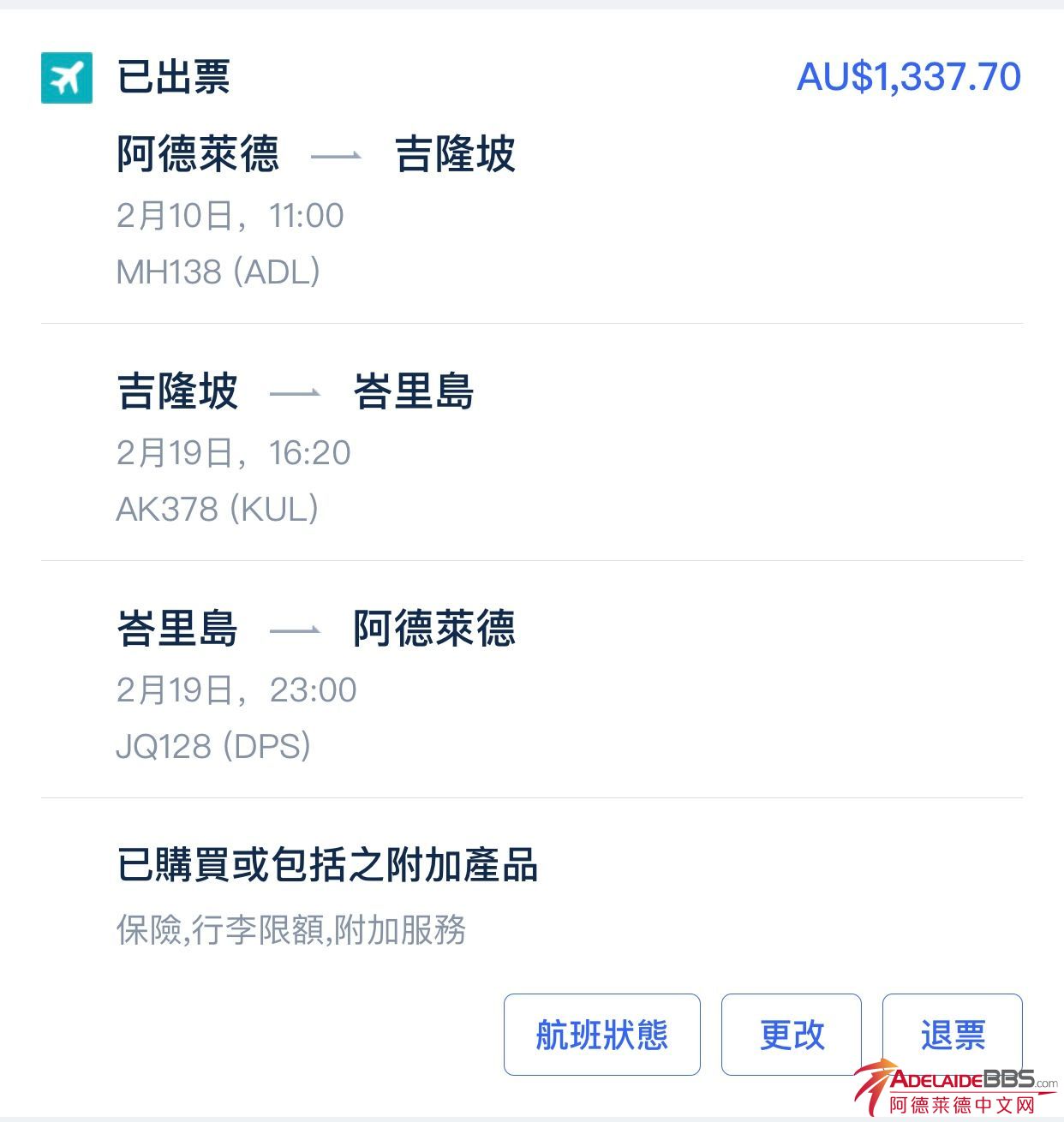售 来回机票 星期五10/02/2023。11:00am阿德莱德到吉隆坡 星期日19/02/2023。16:20pm吉隆坡國際機場到峇里島努拉萊伊機場 星期日19/02/2023。23:00pm峇里島努拉萊伊機場到阿德莱德 已包20KG行李, 7KG ...