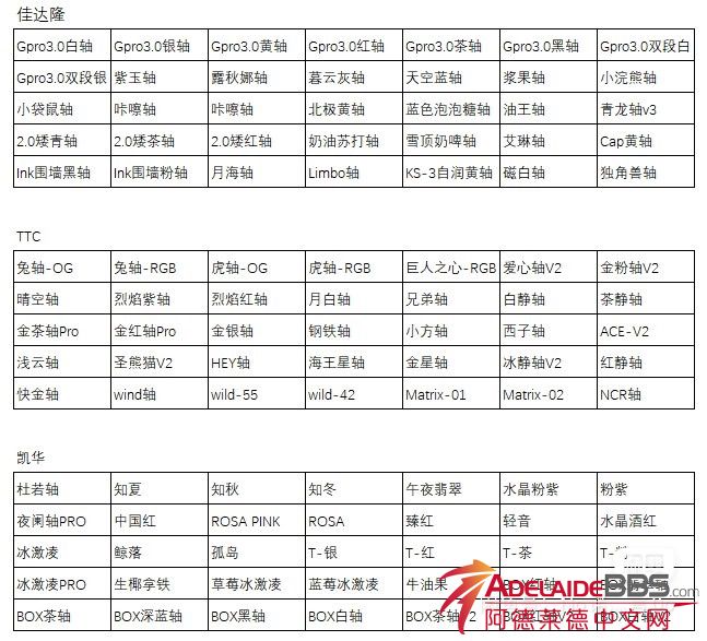 出试轴器大套装 此套装包括: 3个试轴板(每个5x7) 共105个轴体包括佳达隆、TTC、凯华详细名称请参阅图片 105个半透键帽 所见即所得 退烧出全部 全部共$90 campbelltown自取 感兴趣请短信0432335600 谢谢