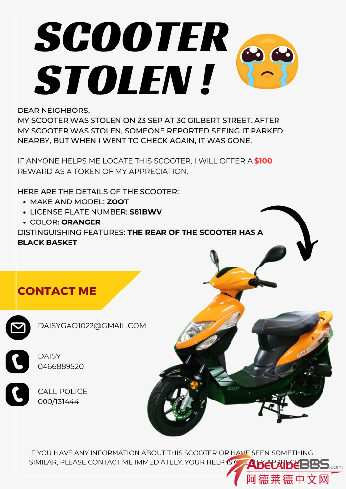 摩托车被偷了,如果有看到车的请联系我0466889520,提供线索找到车的有重金酬谢
