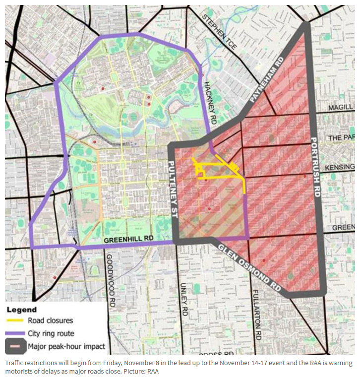 据悉,VAILO Adelaide 500比赛将于下周回归,届时阿德的部分道路交通限制,导致通勤者受到影响。 交通限制将从11月8日星期五开始,直到11月14日至17日的活动结束,RAA警告驾驶者,随着主要道路的关闭,会出现"慢 ...