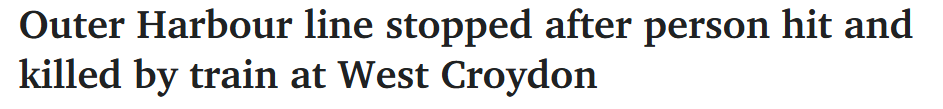 据报道,周四晚,West Croydon发生火车撞人事故,一人当场死亡。 Outer Harbour列车服务暂停,紧急服务人员赶赴现场处理事故,但服务现已恢复正常。 任何目击事故或掌握有用信息的市民,请拨打1800 333 000或 ...