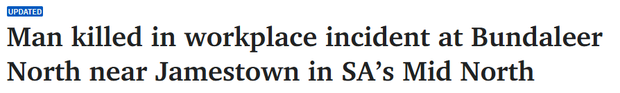 据悉,南澳一名男子于周一下午在该州中北部发生的工作场所事故中死亡。 MedStar医疗队也接到了出警请求,但来自Arthurton的这名34岁男子还是不幸当场身亡。 截至目前,南澳警方和南澳救护车尚无有关该事件的更 ...