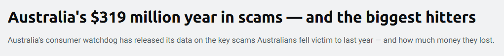 据悉,澳大利亚消费者监督机构公布了去年澳大利亚诈骗受害者的情况,以及他们损失了多少资金。 去年,澳大利亚人在数十万起诈骗案中损失了近3.19亿澳元,其中投资诈骗造成的经济损失最大。 其他值得警惕的骗局 ...