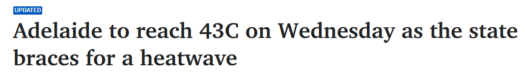 据官方消息称,周三的阿德莱德是世界上最热的城市。 下午1点,气温达到40.8℃,使阿德莱德成为全球最热的城市。 Adelaide Metro表示,由于天气原因,周三下午4:30至6:30高峰时段减少电车服务。 火车服务不 ...