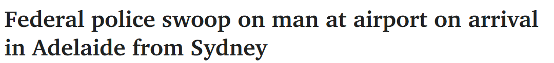 周四晚上,当一名男子抵达阿德莱德机场时,大批警察突然出现。 目击者称,这名男子从悉尼乘飞机抵达后,有20名警察押送他。 "调查仍在进行中,联邦警察局将在适当的时候提供最新情况。" 联邦 ...