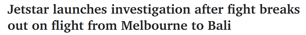 从澳洲起飞的国际航班爆发斗殴事件,航司介入调查! 据悉,捷星航空从墨尔本飞往巴厘的航班上,两名男子发生了激烈冲突和斗殴,一段令人震惊的视频被曝光。据信争执起因于座椅靠背调整问题。 捷星 ...