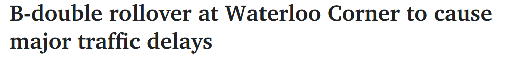 据悉,一辆卡车在阿德北郊Waterloo Corner Rd与northern connector的出口匝道附近翻车,道路已对全部车辆关闭。 北向交通已对全部车辆关闭,警方建议驾驶者绕行,清理工作预计持续整个上午。 ...