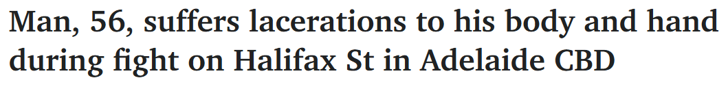 据6月30日报道,周六下午,阿德莱德市中心一条繁忙街道发生暴力斗殴事件,一名男子受伤被紧急送医。 警方在当天下午2:30左右接报称Halifax St有两名男子打架,随即赶往现场。 这起事件发生前几天,周四晚 ...
