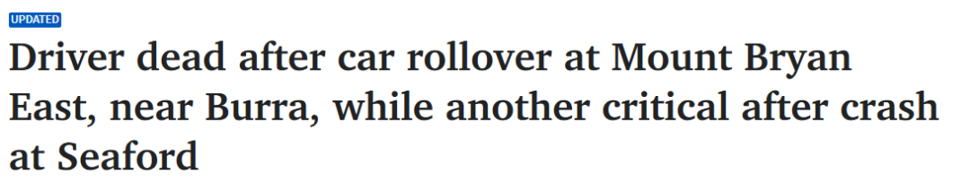 据报道,南澳中北部及阿德南部分别发生一起车祸,造成一男子死亡,另一男子重伤垂危。 周三下午,一名32岁的Burra男子驾驶Ford ute在Mount Bryan East的Dust Hole Creek Rd(一条土路)发生翻车事故身亡。 ...