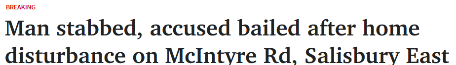 周一晚间,阿德北郊发生一起持刀伤人事件,一名34岁男子胸部被刺伤送医。 警方于当晚8点45分左右接报赶往Salisbury East区McIntyre Rd的一处住宅,在现场发现一名胸部受刀伤的男子。 目前嫌疑人已获保释, ...