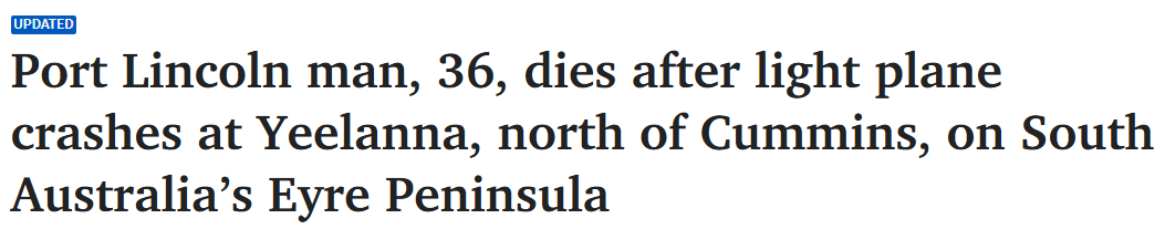 据9月9日报道,南澳Eyre Peninsula发生轻型飞机坠毁事故,一名36岁男子不幸身亡。 周一下午1时30分许,一架用于农作物喷洒的农用飞机在Eyre Peninsula农田坠毁。来自Port Lincoln的36岁男性驾驶员当场死亡。 ...