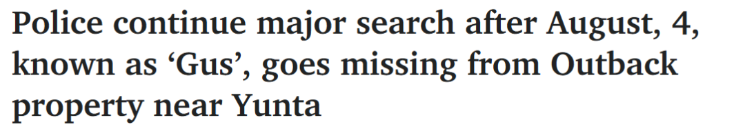 据9月29日报道,周日晚间至周一清晨,南澳警方直升机持续在北部地区上空搜寻一名失踪的四岁男童。这名被称为"Gus"的男童最后一次现身是在周六位于Yunta以南40公里处的自家农庄。 这名四岁男童 August(昵称"G ...
