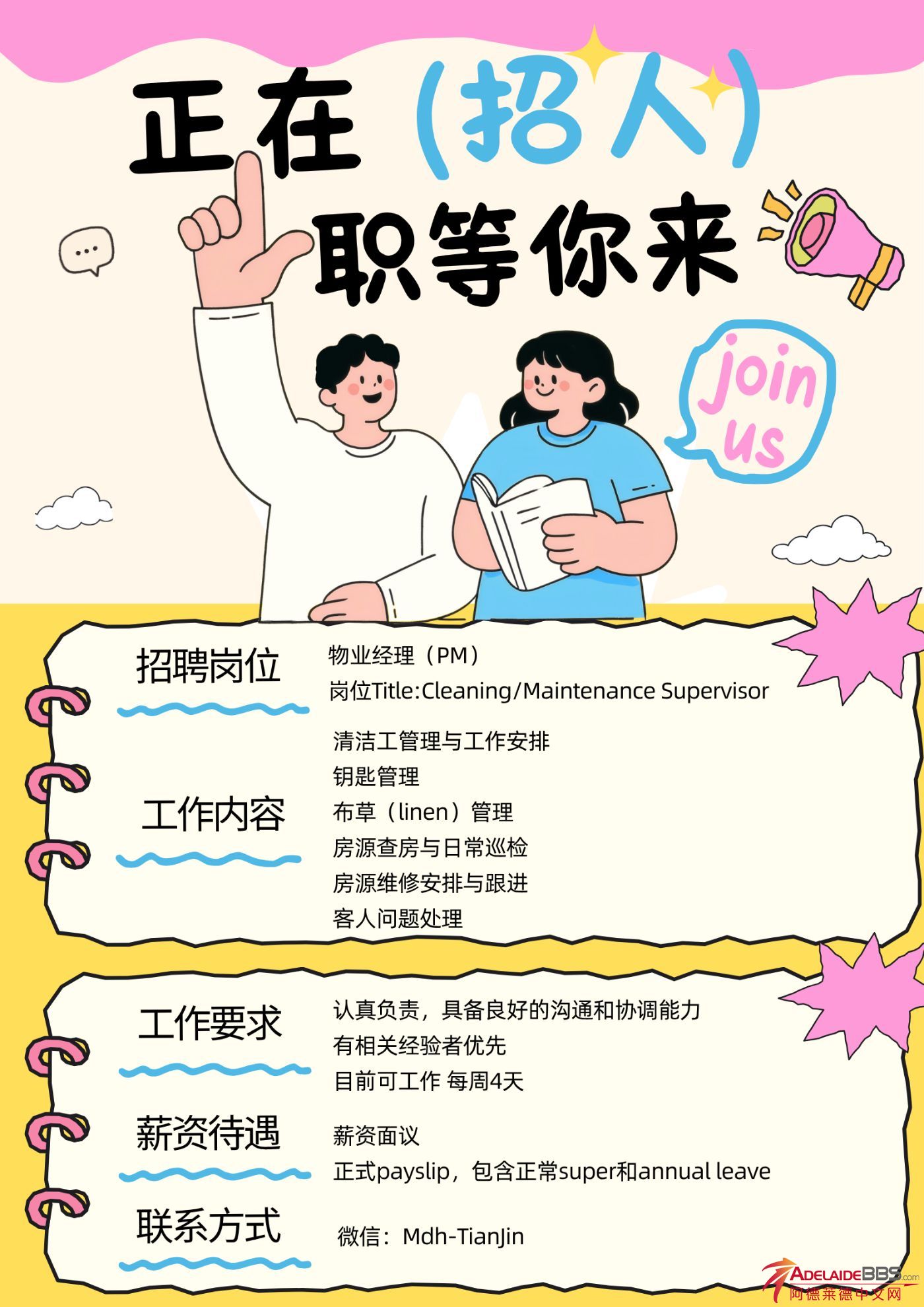 岗位 Title:Cleaning/Maintenance Supervisor 工作内容: 清洁工管理与工作安排 钥匙管理 布草(linen)管理 房源查房与日常巡检 房源维修安排与跟进 客人问题处理 工作要求: 认真负责,具备良好的沟通和 ...
