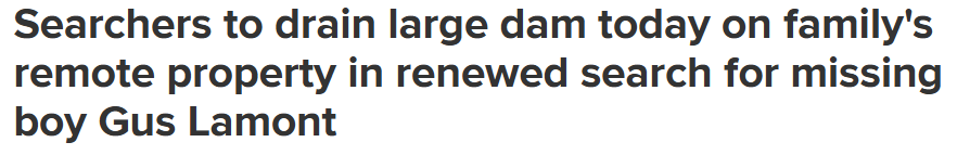 据《9news》10月31日报道,南澳警方计划今日抽干一处偏远牧场内的大型水坝,四岁男童Gus Lamont正是在此地失踪。 这名幼童自9月27日被目击在Yunta以南约40公里的Oak Park Station宅院外玩耍后便失去踪迹。尽管过去 ...