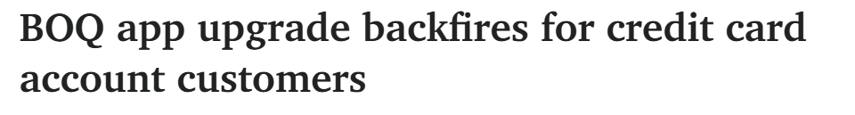 据《couriermail》11月28日报道,昆士兰银行(BOQ)因应用程序更新失败引发客户强烈不满,众多用户连续多日无法访问信用卡账户。该行客户纷纷涌向银行官方Facebook页面宣泄愤怒。 银行原定于上周一前将信用卡账户全 ...