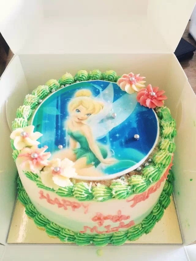 糖霜打印Tinklebell鲜奶油什锦水果蛋糕。蛋糕是巧克力戚风,双层鲜奶油草莓香蕉夹层,烘烤过的椰丝覆面,食用色素打印可以通通吃下肚哦!刚收到反馈,说好吃又好看,小朋友很开心哦!