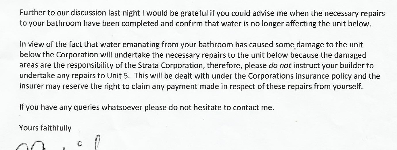 你好! 资料不详尽,很难给你一个明确的法律意见。 我提议你拿这封信连同相关文件一并,找一位律师,并详述事情的经过,拿取一个法律的意见。 一般来说,这些情况都不是容易解决的。 最主要是你有Strata Corporation。Strata Corporation很多时候都会开会决定怎么样处理这些漏水的问题。 此致 郑玉桂律师敬上 澳大利亚国际公证律师 ------------------------------------------------ 澳大利亚国际公证及移民律师 电邮:[email protected] 电话:00618-8359 2526 传真:00618-8359 2843 地址:1/F Pulteney Centre, 186 Pulteney Street, Adelaide SA 5000 |