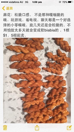 麻花:松脆口感, 不是那种嘎嘣脆的哦,玩游戏,看电视,聊天都是一个好选择的小零嘴哦,放几天还是会松脆的,不用怕放太多天就会变成软biabia的 ,1根$1,5根起卖,想要的微信:451128593